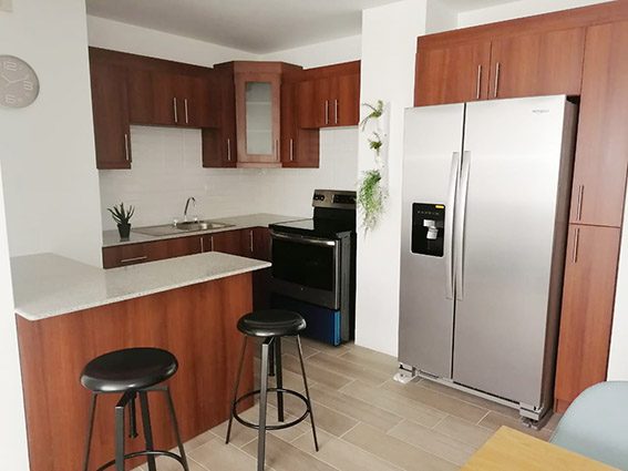 Torre de 5 niveles con elevador, dentro de Condominio. Sala – comedor- cocina en un espacio. Gabinetes de cocina. 1 dormitorio con closet, sala, Parqueo techado. Disponibles opciones con estudio.